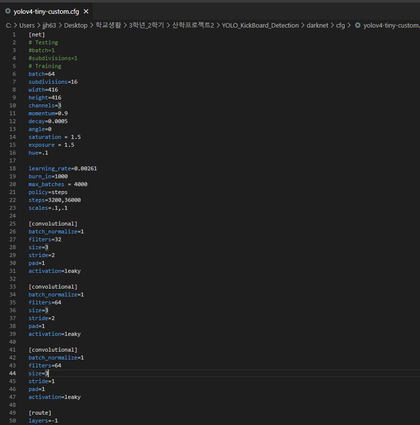 우선, /darknet/cfg/yolov4-tiny-custom.cfg로 이동합니다.