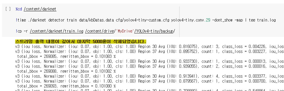 !time ./darknet detector train data/kbDatas.data cfg/yolov4-tiny-custom.cfg backup/yolov4-tiny-custom_5000.weights -dont_show -map l tee train.log