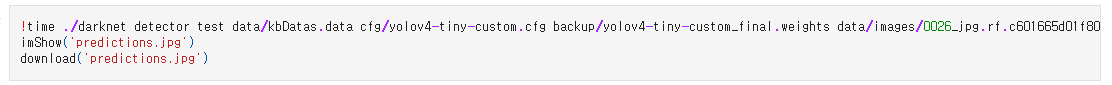 !time ./darknet detector test data/kbDatas.data cfg/yolov4-tiny-custom.cfg backup/yolov4-tiny-custom_final.weights -dont_show -ext_output <data/list/test.txt> result_v4.txt